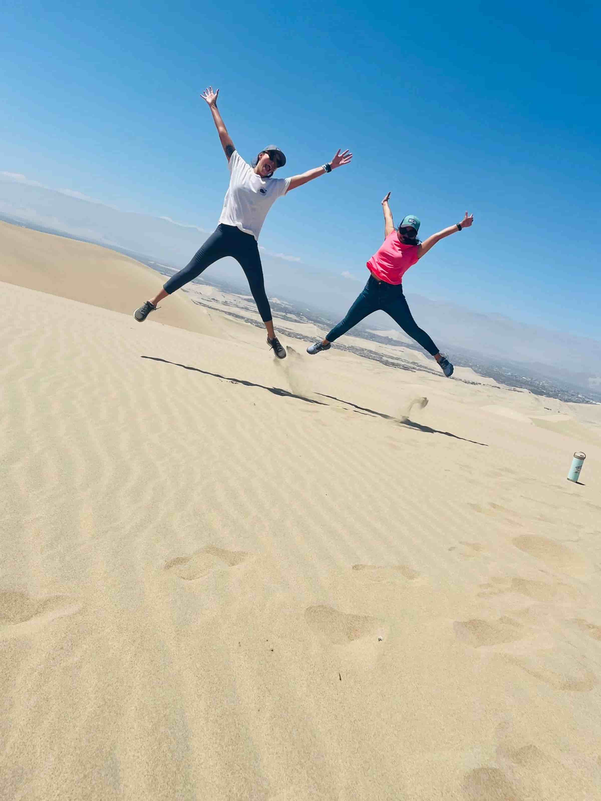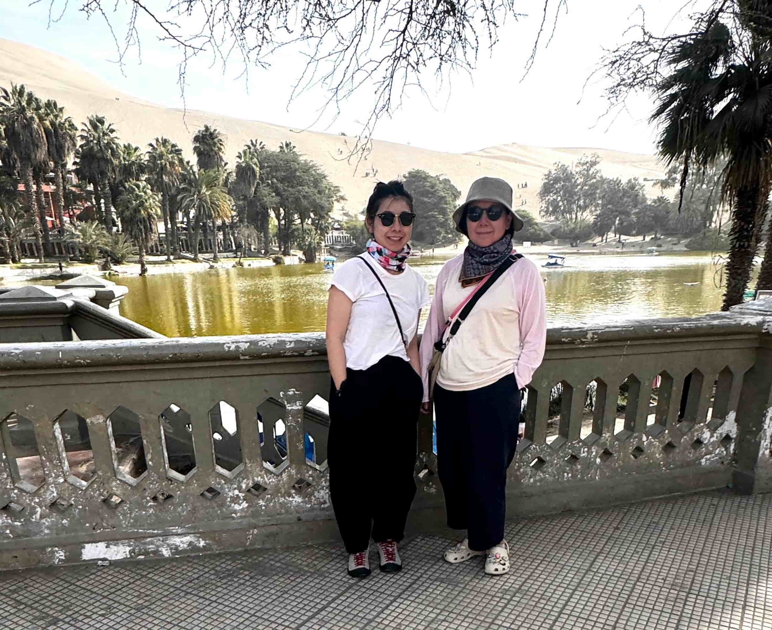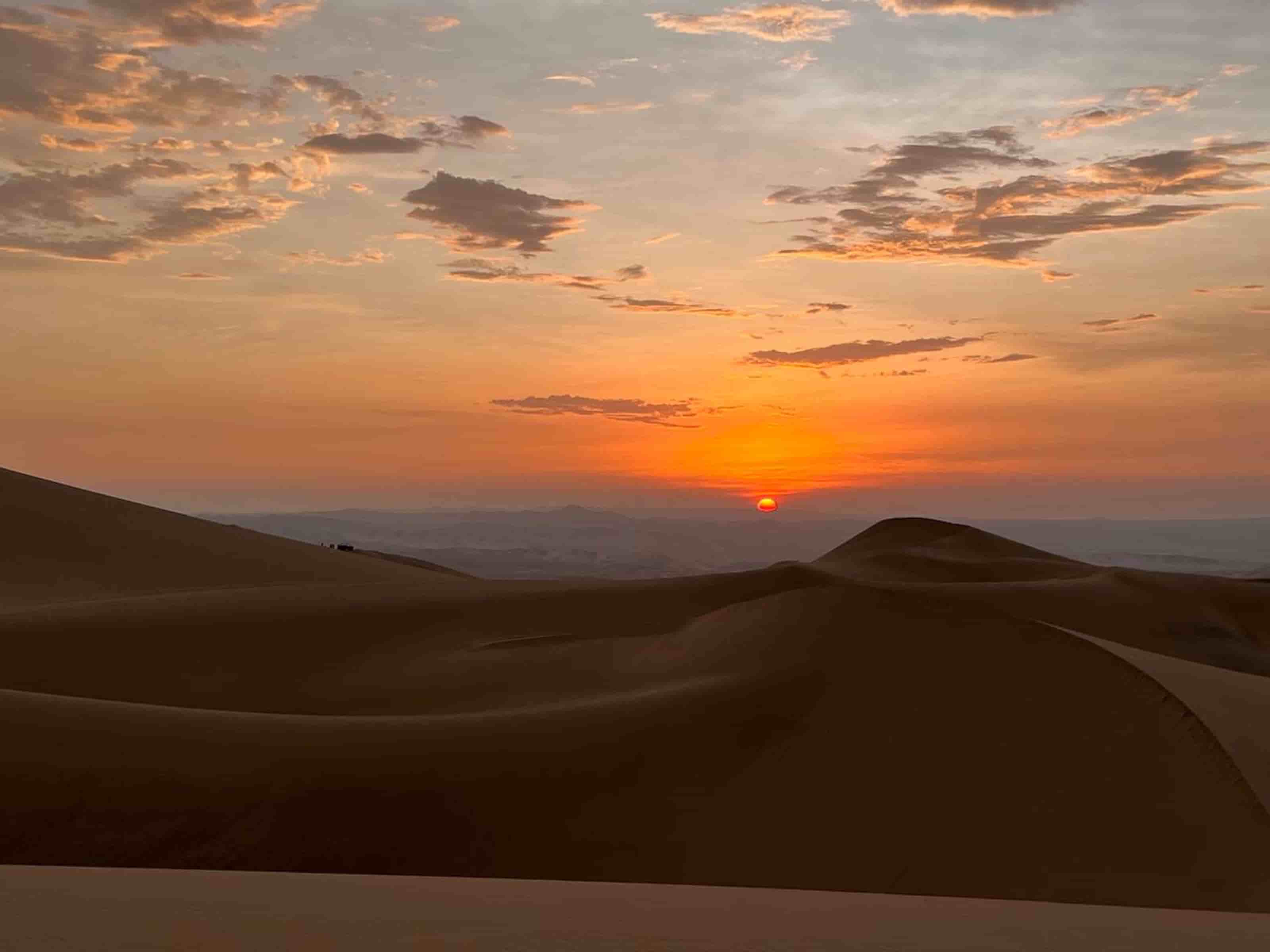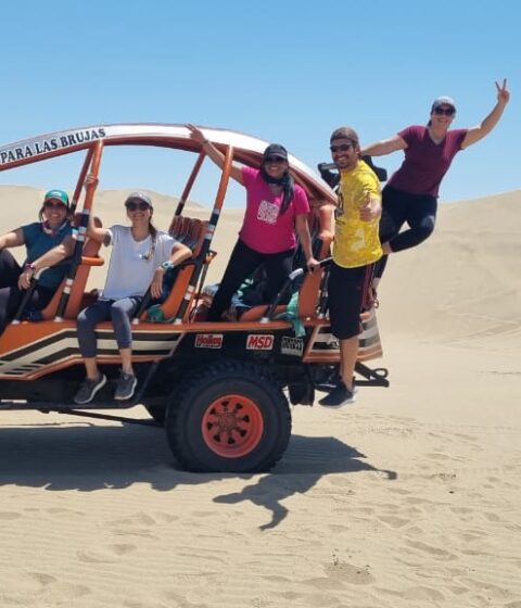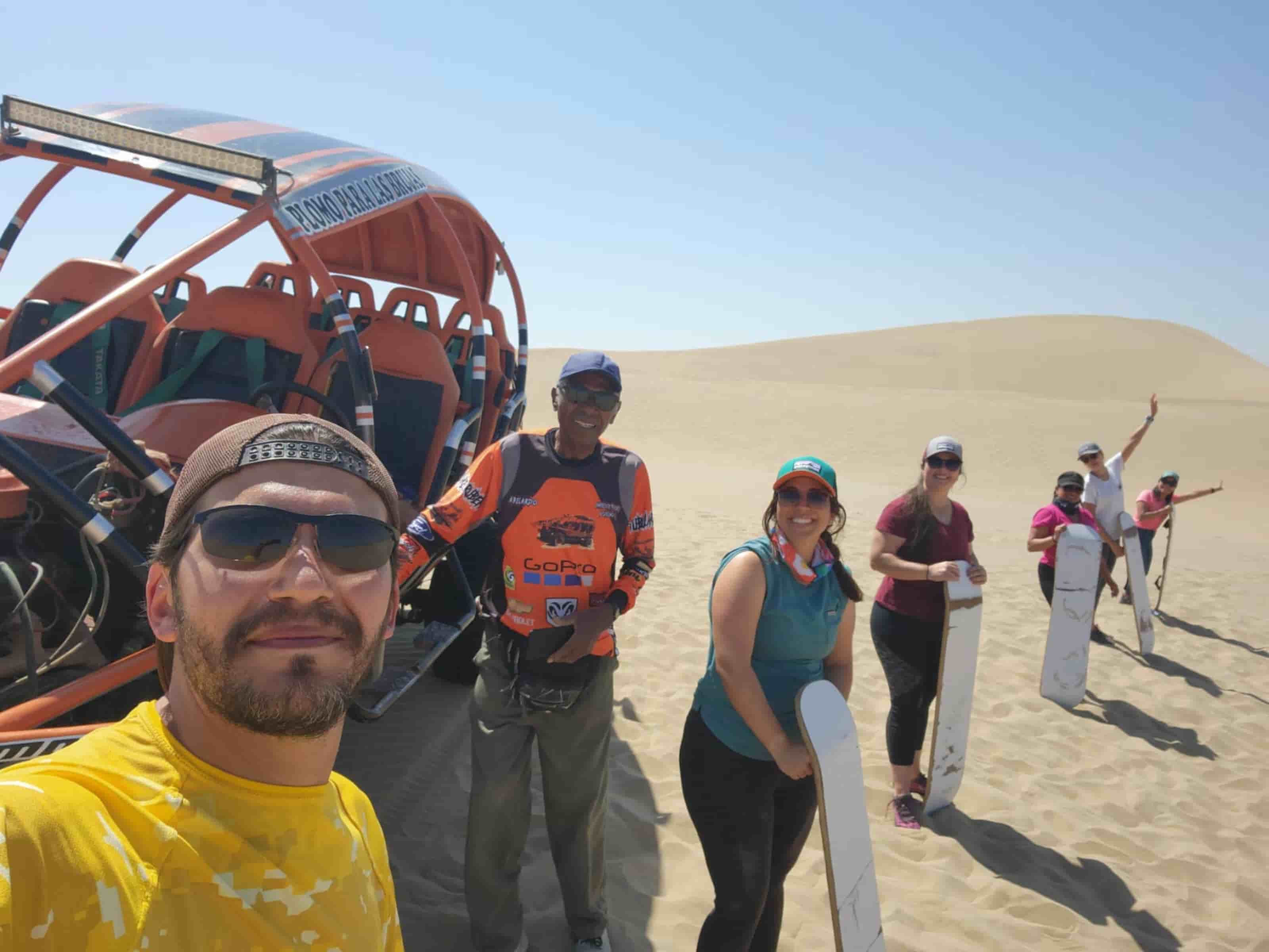 Our travelers will arrive at the Huacachina Oasis it’s a lagoon surrounded by palm trees and towering dunes.